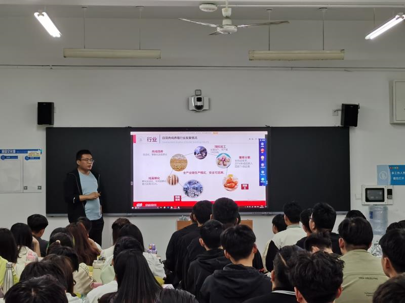 生产经理常雷亭从家禽养殖在第一产业中的发展情况、白羽肉鸡养殖行业发展和凤祥白羽肉鸡养殖三方面展开讲述,对畜牧行业发展前景和发展形式进行了详细分析,对畜牧生产的现代化情况进行分享,帮助同学们了解现代化养殖生产环境。